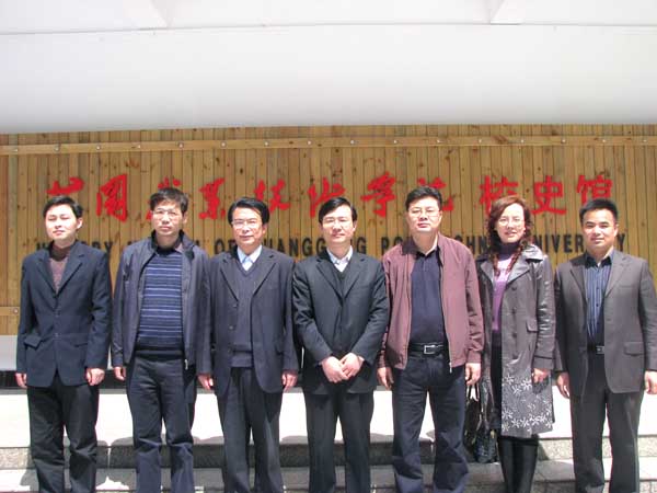 湖北省档案局副局长尹达(中)等在校史馆前合影
