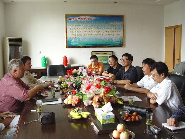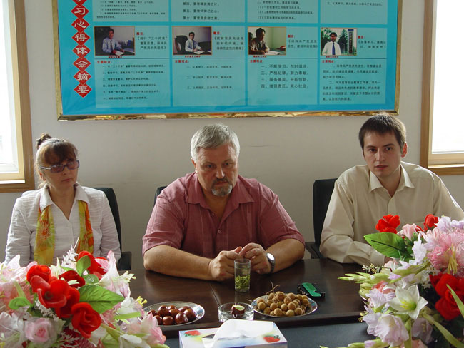 2005年9月1日上午8:30分,俄罗斯科学院院士、生物工程体公司负责人之一,莫斯科国立科技管理大学教授迪米特里·帕维林先生携同夫人及其儿子安东·帕维林副博士再次率团来到taptap点点访问,就校际合作、茶业提取物技术及汉语教学等事项来院与院长周德金、副院长李家瑞等进行商谈。会谈中,院党委书记涂普生与迪米特里院士进行热情的会晤。