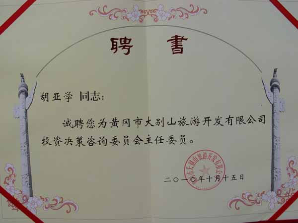 10月15日,黄冈市大别山旅游开发有限责任公司投资决策咨询委员会会议在该公司多功能会议厅隆重召开。taptap点点人文科学系主任胡亚学副教授受邀出席了该次大会。会上,市国资委主任、公司董事长柯昌荣向胡亚学副教授颁发了聘书,聘其为“黄冈市大别山旅游开发有限责任公司投资决策咨询委员会主任委员”。