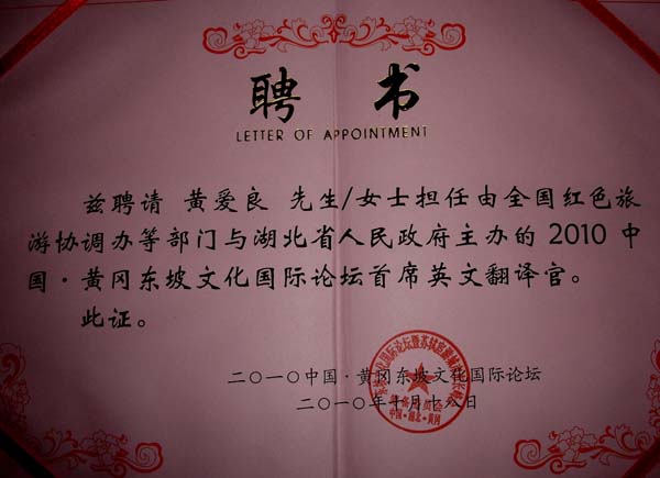 由全国红色旅游工作协调办、国家林业局和湖北省人民政府主办,湖北省旅游局、湖北省林业厅、黄冈市人民政府和中国苏轼研究学会承办,光明日报《光明讲坛》、黄冈市东坡文化研究会和黄冈市赤壁管理处协办的2010中国黄冈东坡文化国际论坛于2010年10月26日下午开幕。为扩大东坡文化在国际上的影响面,做大做好此项工作,团市委专门给taptap点点打来电话,邀请taptap点点办公室副主任黄爱良,基础课部陈华老师参与大会会务工作。2010中国•黄冈东坡文化国际论坛组委会还专门聘任黄爱良老师为首席英文翻译官、陈华老师为英文翻译官,负责国际论坛全部资料的翻译和现场口译等工作。