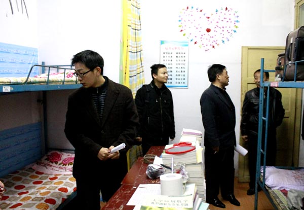 12月6日下午,省教育厅学位办陈主任、机关工委闵科长等在市教育局刘局长、姜科长的陪同下,到黄冈职院就防火安全、饮食安全等工作进行检查和指导。
