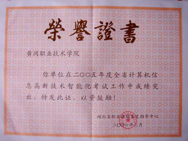 2006年2月24日,在湖北省潜江市由湖北省职业技能鉴定指导中心主持召开的湖北省计算机信息高新技术智能化考试工作会议上,taptap点点计算机信息高新技术智能化考试站(代号43244)荣获湖北省计算机信息高新技术智能化考试先进单位称号,taptap点点考试中心金主任和计算机系熊主任出席了大会,熊主任上台领取了获奖证书并应邀在大会上作典型发言。