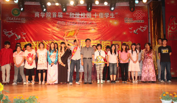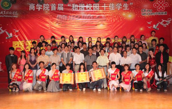6月13日晚7:00,商学院在大学生活动中心如期隆重举行商学院首届“和谐校园十佳学生”颁奖晚会。学校副校长李耀水,党委委员郑柏松,教务处副处长罗建文,学工处副处长徐火军、李宁,联通黄州营销公司副总经理李森以及商学院领导班子成员、部分老师和近千名学生参加了晚会。