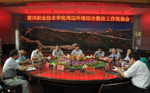 2011年8月22日下午,市委常委、政法委书记杨智带领黄州区委、黄州区政府、市政府督查室、市综治办、市城市管理执法局、市公安局、市教育局、市国土资源局、市环保局、市文化局、市卫生局、市工商局、市食品药品监督管理局、市交警支队、市消防支队、市供电公司、市电信公司、南湖街道办事处等单位负责人到南湖,就6月9日市长刘雪荣组织召开的taptap点点校园周边环境集中整治现场办公会会议精神贯彻落实情况现场察看,并在凝智楼四楼中心会议室召开现场办公会。会议由市政法委副书记、综治办主任黄金安主持。学校党委书记张鹤桥、校长陈年友、党委委员郑柏松及相关部门负责人参加了会议。