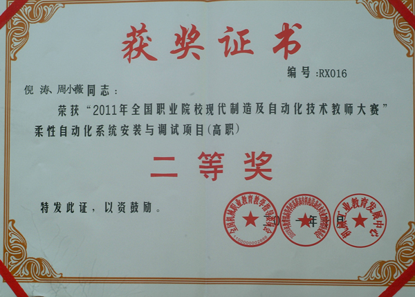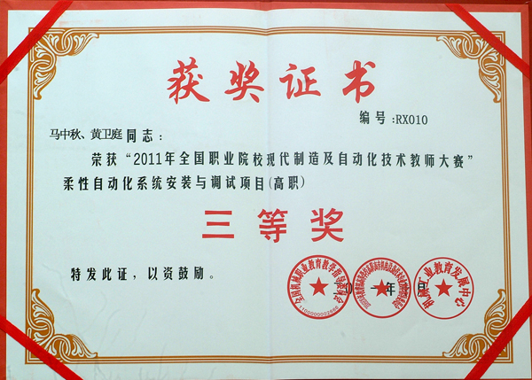 全国首届“职业院校现代制造及自动化技术教师大赛”于2011年10月28至30日在浙江机电职业技术学院隆重举行。taptap点点机电学院组织2个教师代表队参加此次大赛,经过参赛教师的团结协作、奋力拼搏,在激烈的竞争中喜获佳绩。倪涛、周小薇代表队获得“柔性自动化系统安装与调试”项目比赛全国二等奖,黄卫庭、马中秋代表队获得该项目比赛全国三等奖。同时,倪涛、周小薇老师分获“全国机械职业院校人才培养优秀教师”荣誉称号。