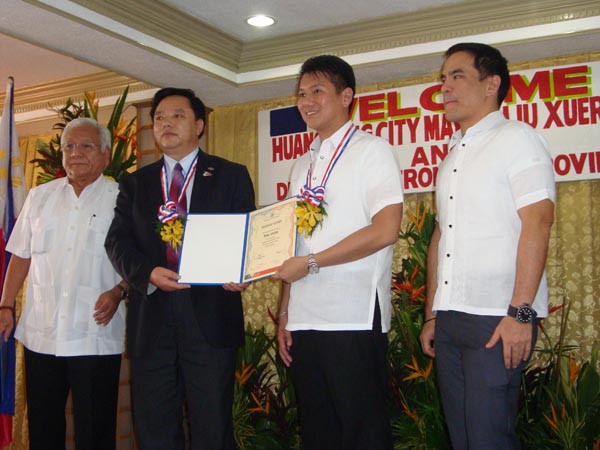 菲律宾依木斯市市长EMMANUEL L.MALIKSI(右二)授予校长陈年友荣誉市民证书