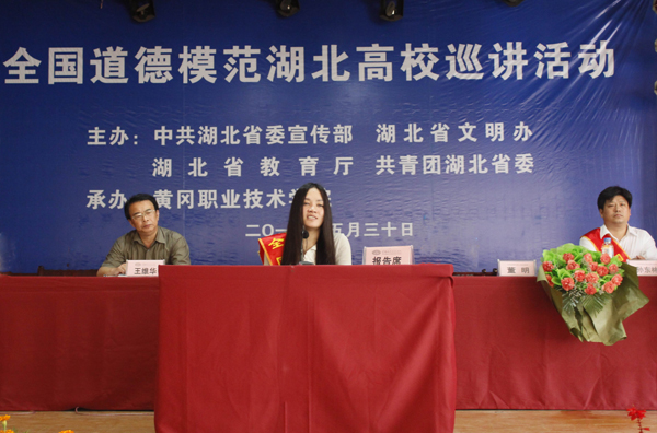 报告会由党委委员郑柏松主持。他在总结讲话中说:三位全国道德模范来到taptap点点,带来了他们的感人事迹,带来了他们的心路历程,更带来了他们的精神魅力和道德感召力。三位全国道德模范的真情讲述在平凡中见伟大,从中我们读出了对家、国、天下的担当,看到了真、善、美的中华美德,更感受到了社会主义核心价值的时代力量。全国道德模范代表走进革命老区大别山,为taptap点点两万余名师生带来了丰富的精神食粮。希望全体师生员工以全国道德模范为榜样,秉承革命老区的优良传统,爱岗敬业、乐于奉献、教书育人,希望各位同学认真学习他们的崇高精神,传播优秀道德文化,成长为信念执着、品德优良、知识丰富、本领过硬、开拓创新的高端技能型人才,为中华民族的伟大复兴而努力奋斗,用优异的成绩喜迎党的十八大胜利召开。