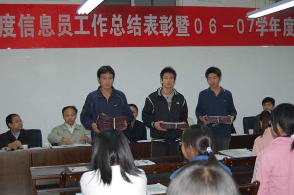 其次,大会对2005—2006学年度优秀学生信息员及学习部干部进行了表彰。李处长宣读了表彰文件,吴丹华等30名优秀信息、张晓蓉等5名优秀学习部长、董文等19名学习部成员、肖曼等45名学习委员受到了表彰,出席大会的领导和老师给他们颁发了荣誉证书。
