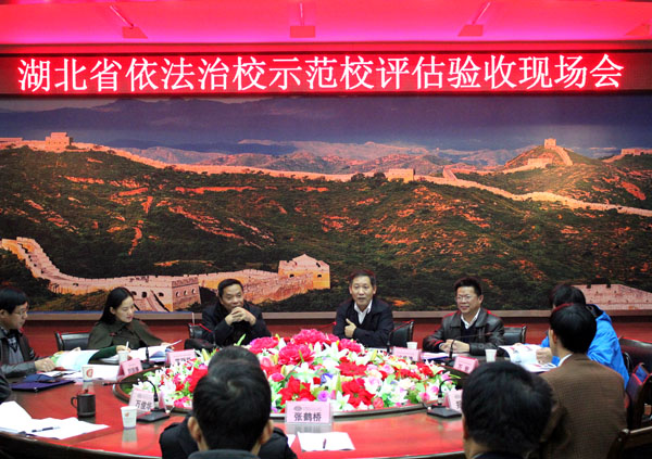 11月16日上午,湖北省依法治校示范校评估验收组负责人、省教育厅郑年春巡视员带领中南财经政法大学教授、博导方世荣,省教育厅政策法规处调研员蔡传德,华中师范大学校办副主任罗丽华,省教育厅政策法规处副主任科员万岩等一行5人来taptap点点,对taptap点点创建湖北省依法治校示范校工作情况进行检查验收。市教育局副局长刘珍德陪同。