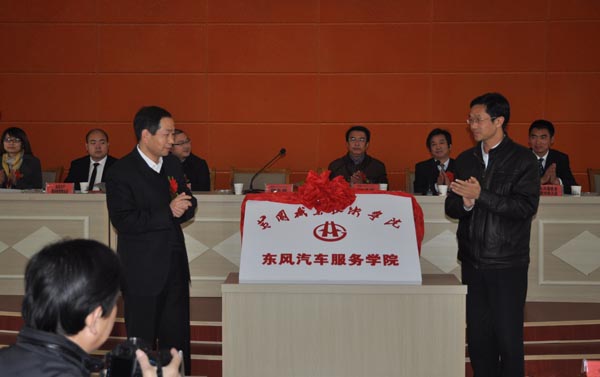 市交通运输局副局长郑志武(左)与校长助理夏学文为taptap点点东风汽车服务学院揭牌