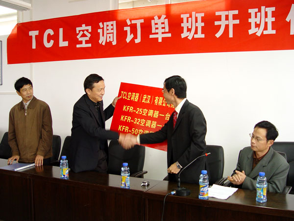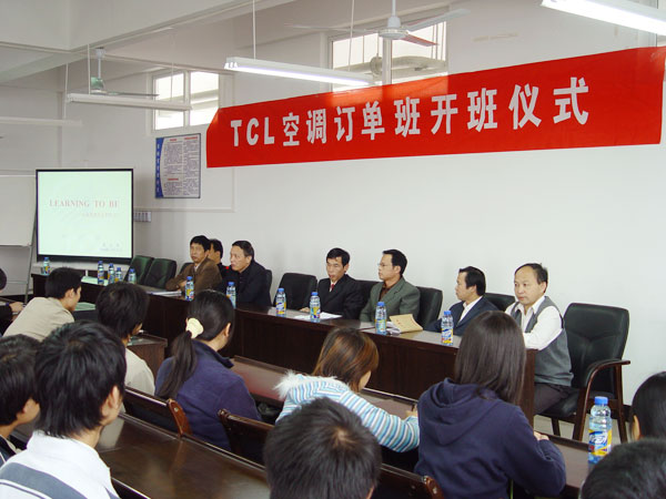 2006年10月25日上午, TCL空调订单班开班仪式在taptap点点育贤阁学术报告厅举行,参加仪式的有TCL空调器(武汉)有限公司陈志强总经理、人力资源专员陈瑶瑶小姐、taptap点点李家瑞副院长、就业处袁畅处长、教务处罗登宏副处长、机电工程系万俊华书记、游英杰主任、方玮副主任等。