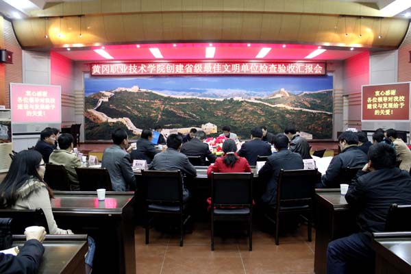 黄冈职院党委书记张鹤桥、校长陈年友、党委副书记王维华、党委委员郑柏松出席汇报会。陈年友主持。张鹤桥致欢迎词。王维华作了学校创建省级最佳文明单位工作汇报。专家组在检查工作中,实地查看了校容校貌,对黄冈职院师生组织开展的红色文化、区域文化、寝室文化、餐厅文化、企业文化等特色文化进行了察看,查阅了学院创建省级最佳文明单位工作资料。在省级最佳文明单位创建工作中,学校大力强化领导,围绕提升思想道德、业务能力和办学治校水平等,切实抓好创建工作,不断丰富文明创建内容,提高文明创建成效。