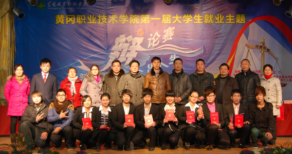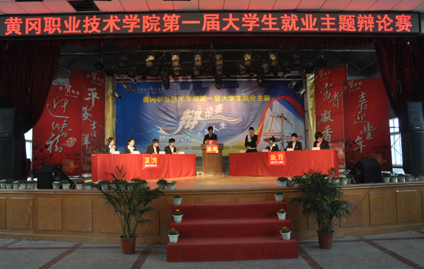 以“破解大学生就业问题的关键在于增加就业机会还是提高个人素质”为辩题的黄冈职院首届大学生就业主题辩论赛,于2012年12月19日下午2:00,在学校大学生活动中心隆重举行。校党委委员郑柏松、建筑学院院长刘晓敏、就业指导处副处长舒瑞琼、学工处副处长焦爱新、各教学学院分管就业工作的领导、就业联络员及全校近1000名师生观看了比赛。