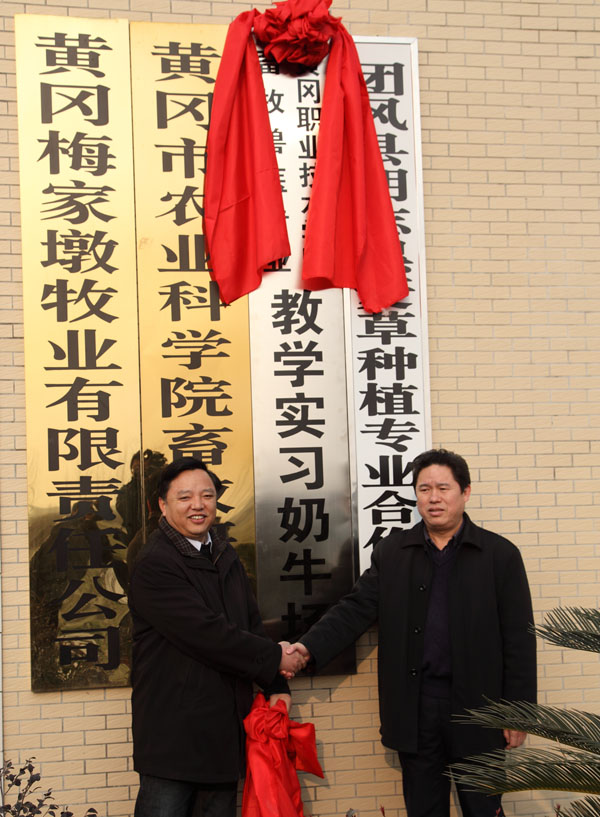 陈校长一行首先考察了黄冈市农科院梅家墩牧业有限责任公司,并和瞿学文院长一起为“taptap点点畜牧兽医专业奶牛生产教学基地”揭牌。交流期间,瞿学文介绍了黄冈市农科院自1949年成立以来在技术研发、技术推广、技术应用等方面取得的成绩,以及在市委市政府的支持下建设梅家墩千头奶牛场的情况。陈年友介绍了taptap点点近年来在教学、科研等方面的成果,并表示学校与科研院所之间在学生实习、就业、技术研发、员工培训、教师锻炼、共建基地等方面可以强强联合,共同为黄冈的经济建设、为三农服务做出应有的贡献。