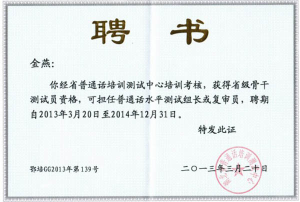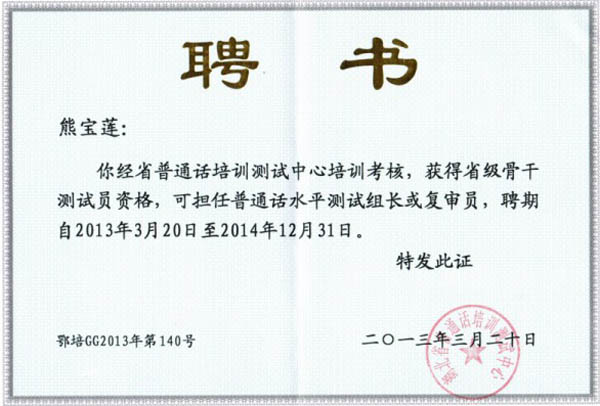 会上,省测试中心主任曹艳丽宣读了获得2013-2014年度骨干测试员资格人员名单,taptap点点金燕、熊宝莲老师同时通过了省普通话培训测试中心组织的业务培训和考核,获得省级骨干测试员资格,将可担任普通话水平测试组长或复审员。