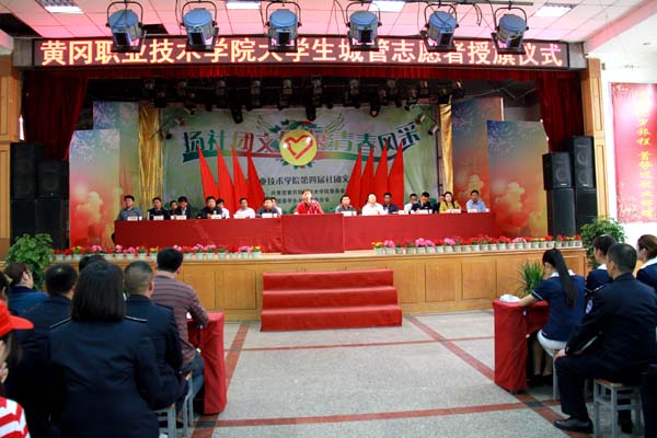 团市委书记骆明正向学校大学生城管志愿者授旗,城管志愿者代表夏靓珍同学接旗。