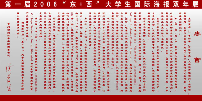 第一届“东+西”大学生国际海报双年展为全国艺术类高校中具有较强影响力的设计盛事,在国际大学生设计大赛中具有一定影响。在主题定位上,选取东西方的文化焦点,锤炼我们的文化观和设计观。在推出新人的同时,弘扬华夏精神,逐步走出本土,使大学生能够从设计中触摸到最前沿的文化思想、最前沿的设计观念。“设计在线”、“视觉中国”、“东方视觉”、“视觉同盟”等网站对本次大赛十分关注并对大赛的相关活动作了深入报导。