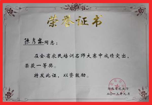 2013年9月25日,taptap点点生物化工学院教师陈彦霖作为黄冈市代表参加湖北省农业厅组织的首届农民培训名师大赛,喜获一等奖。