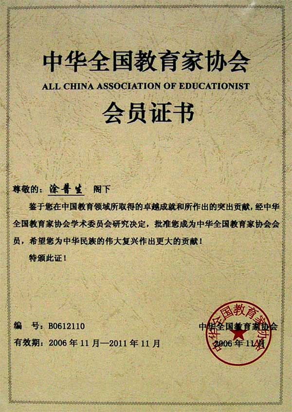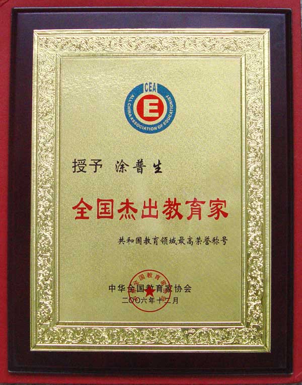 喜讯:党委书记涂普生同志荣获“全国杰出教育家”称号 来源:宣传部 作者:宣传部 发布时间:2016-01-16 11:23:55 浏览次数: 次 【字体:小 大】 2006年11月,中华全国教育家协会经研究决定,吸收院党委书记涂普生同志为中华全国教育家协会会员,任期5年。 2006年12月,中华全国教育家协会授予涂普生同志“全国杰出教育家”荣誉称号。 “全国杰出教育家”荣誉称号,是共和国教育领域最高荣誉。涂普生同志获此殊荣,既是他本人的光荣,同时也是taptap点点的光荣,是对学院改革、建设、发展高等职业技术教育取得成绩的充分肯定。 分享到: 【打印正文】