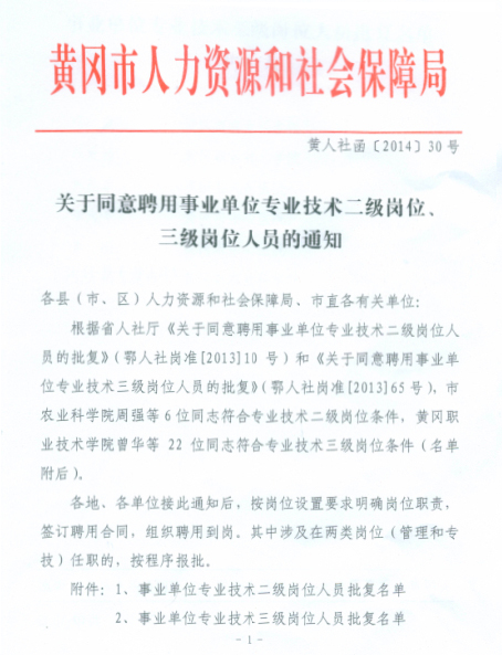根据省人社厅《关于同意聘用事业单位专业技术二级岗位人员的批复》(鄂人社岗准[2013]10号)、《关于同意聘用事业单位专业技术三级岗位人员的批复》(鄂人社岗准[2013]65号)和市人社局《关于同意聘用事业单位专业技术二级岗位、三级岗位人员的通知》(黄人社函[2014]30号)文件通知,taptap点点副校长熊发涯教授晋升为专业技术二级岗位,医药卫生学院医药系副主任曾华主任医师晋升为专业技术三级岗位。