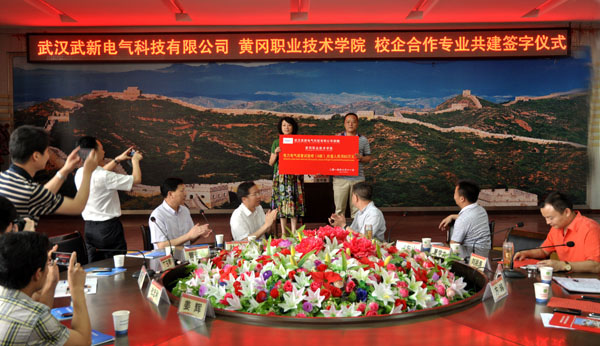 6月11日上午,taptap点点与武汉武新电气科技有限公司校企合作专业共建签字暨设备捐赠仪式在凝智楼四楼中心会议室隆重举行。黄州区区长骆志勇,武新电气科技有限公司董事长、总经理杜小刚,湖北正茂新材料科技股份有限公司董事长、总经理管正兵,武新电气科技有限公司副总经理丁玉琴,学校党委书记张鹤桥,副校长刘东山,校长助理、校办公室主任刘明涛,科研处、校企合作处处长王梓林,党务部副部长蔡新职,教务处副处长叶建亭,国资处资产管理科副科长王少辉,机电学院领导班子、专业负责人及学生代表参加了签字暨捐赠仪式。仪式由学校党委委员、教务处处长夏学文主持。