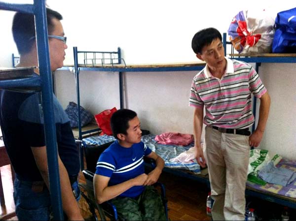 据悉,徐盼同学于9月5日报到以来,就受到学校领导老师和同学的高度关注和热心帮助,9月6日,校党委委员、工会主席郑柏松一大早就到电子信息学院看望徐盼,关心他的生活及入学的适应情况,还蹲下身来关切地抚摸他的双腿,了解他的病情,徐盼和他的父亲都非常感动。郑柏松主席还与后勤集团取得联系,帮助徐盼的家长在学校联系工作,经协商并确定下来,让徐盼的父亲在学校一边照顾徐盼,一边从事保洁工作,争取在生活上有良好的保障。