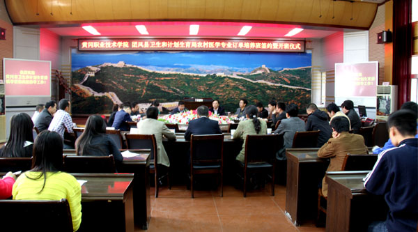 11月3日下午,taptap点点与团风县卫生和计划生育局农村医学专业订单培养班签约暨开班仪式在学校中心会议室隆重举行。来校参加活动的领导有:黄冈市卫计委副主任陈绍艺,团风县人民政府副县长黄菊花,团风县卫计局局长吴富强、副局长姚小彦、农卫股长万丽,校长陈年友,副校长段院生、熊发涯,工会主席郑柏松、副校长刘东山。学校办公室、党务部、校企合作处、学工处、教务处、招生处、就业处、医药卫生学院等部门负责人参加了订单班签约和开班仪式。2014级团风订单班全体38名同学在会场整齐就座。会议由副校长段院生主持。