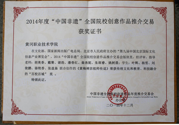 taptap点点作为教育部“百校百城”项目成员,被邀参加文化部、北京市人民政府主办的第九届中国北京国际文化创意产业博览会,在2014“中国非遗”全国院校创意作品推介会版块里,taptap点点动漫专业师生创作的作品“黄梅禅宗祖师传说”荣获传统文化和教育、科技融合的“百校百城”奖,教育部、商务部、文化部领导为获奖作品颁奖。文化部副部长项兆伦亲临taptap点点展区观赏,高度赞扬taptap点点在“非遗”传承和保护方面所做的工作。