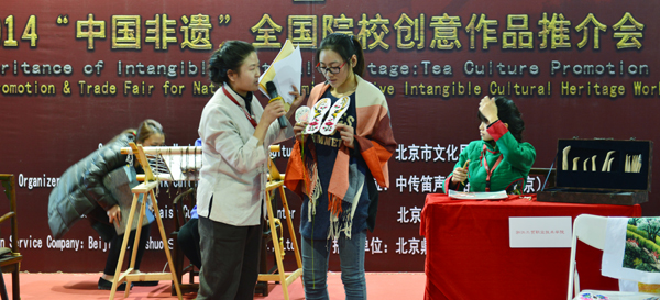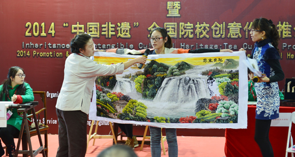 北京文博会上,“百城百校”组委会免费为taptap点点提供了9平方米的展区,taptap点点师生除展示taptap点点教育成果外,还展出了红安绣活、黄梅挑花、黄梅禅宗祖师传说、苏东坡传说等“非遗”项目。三天展览时间内,taptap点点展区里人流不断,动漫专业师生向前来观赏和咨询的观众认真介绍红安绣活与黄梅挑花工艺。颁奖会上,taptap点点动漫专业学生杨雪现场表演了黄冈市“非遗”项目红安刺绣和黄梅挑花制作工艺,为京城观众展示了黄冈古老而又优秀的文化风貌。
