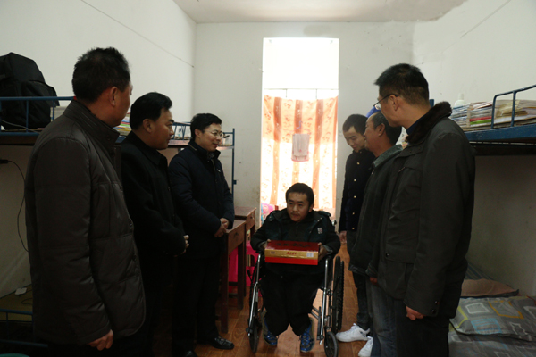 1月13日上午,寒意袭人,副校长熊发涯教授率学工处处长熊楚舒老师,电子信息学院党总支书记冯军老师、院长罗幼平老师、副书记程朗老师、学工处学生管理科副科长吴冬老师和电子信息学院全体专职辅导员一行为电子信息学院的两名贫困生送去了寒冬里的温暖。