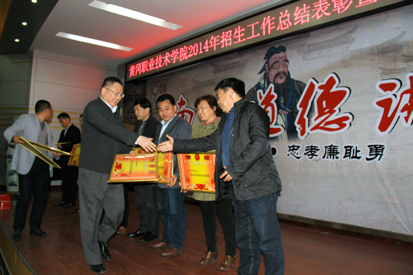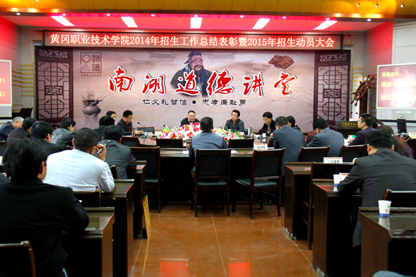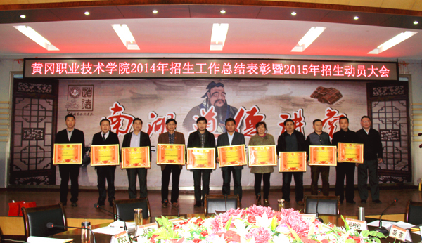 3月26日,学校在凝智楼四楼中心会议室召开了2014年招生工作总结表彰暨2015年招生动员大会。参加大会的有校长姜安心,工会主席郑柏松,副校长刘东山,党委委员胡燕、夏学文;各招生责任区负责人,招生联络员,招生工作处全体人员,受表彰的招生先进个人。大会由党委副书记王维华主持。