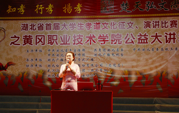 4月14日晚,由中共湖北省委宣传部、共青团湖北省委、中共湖北省委高校工委、中共湖北省委讲师团、湖北广播电视台联合举办的以“知孝、行孝、扬孝”为主题的“楚天弘文尚德——湖北省首届大学生孝道文化征文、演讲比赛”活动之一的大学生公益讲坛活动走进黄冈,taptap点点近1000余名师生齐聚大学生活动中心,聆听了中国国学院大学智慧研究院国学导师李星莹老师题为《百善孝为先》的主题报告。校长姜安心,党委副书记王维华,党委委员、工会主席郑柏松参加了报告会。