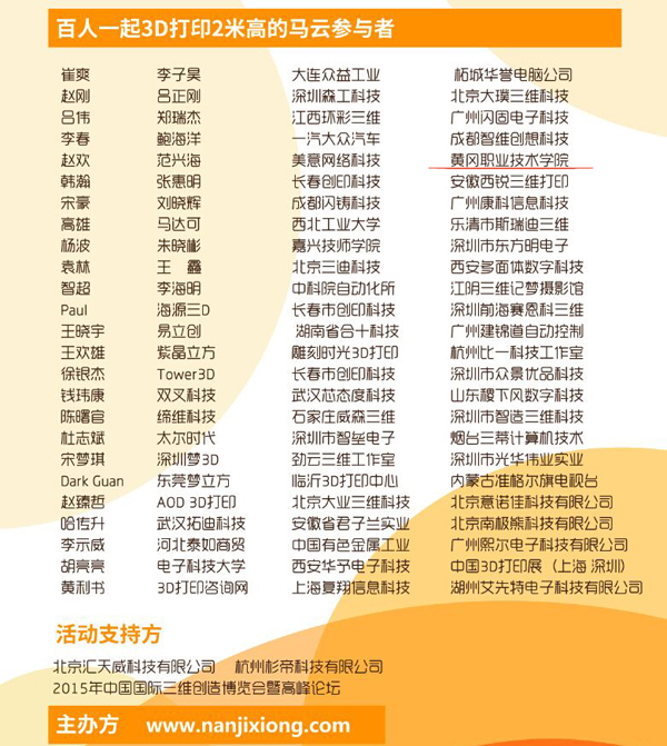 这个巨型马云,是中国3D打印第一互动平台——南极熊3D打印网在2014年年底发起的一次全国性活动,经过申请和筛选,taptap点点成功入选。机电学院工业设计专业学生在王治雄、曹明顺老师指导下,顺利完了MA3-B-1D、MA2-B-1B、MA2-A-1A三块打印任务。