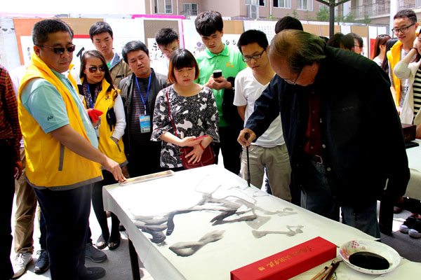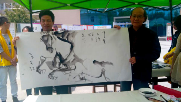 参观完交通学院,营员们参观了汇贤阁前的书画展。书画协会的同学们笔走龙蛇、深钩浅画,古典书画的韵味在笔尖流淌。应老师和同学们邀请,与营员们一同来交流的马来西亚书画家林荣光先生现场写下了表达武汉精神的“追求卓越,敢为人先”8个大字,同时画了一幅马送给taptap点点做纪念。林先生翰墨一点,栩栩如生的奔马就在纸上跃动,博得现场老师和同学们阵阵喝彩。