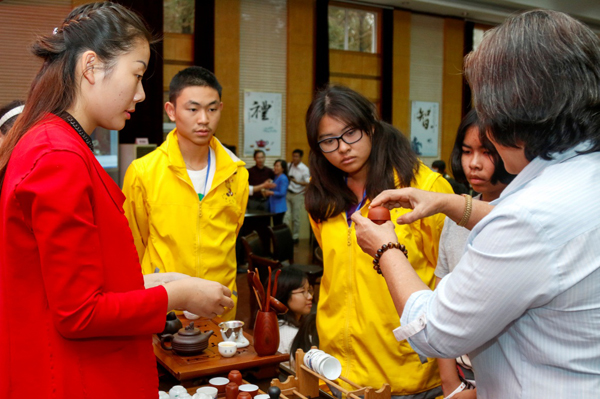 随后,营员们观看了taptap点点学生社团表演的精彩节目。苍劲有力的武术表演,柔美多姿的舞蹈表演,引来了营员们的尖叫鼓掌。他们用这种热烈的方式传达他们对中国传统文化的欣赏和喜爱。欢迎会后,营员们听取了市博物馆张领书记带来的黄梅戏演唱和赏析,张书记一边讲、一边唱,让在场的人过了一把黄梅戏瘾。之后,taptap点点茶叶专家王东明副教授给营员们带来了一堂茶文化课,同时进行了茶艺表演,营员们品尝着十几道工序沏出来的茶,加深了对中国茶文化的理解。