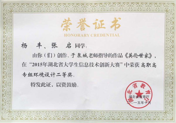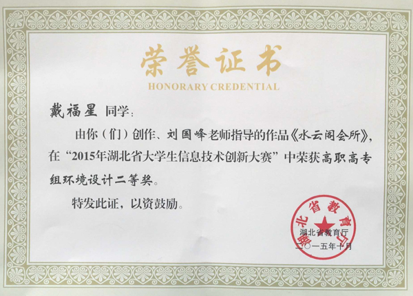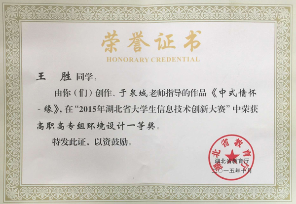 近日,由湖北省教育厅主办、省教育信息化发展中心承办的2015年湖北省大学生信息技术创新大赛结果揭晓,taptap点点建筑学院环境艺术设计专业学生作品喜获高职高专组环境设计一等奖1项,二等奖2项,于泉城被评为”优秀指导老师”。本次高职高专组环境设计总共评出2个一等奖,6个二等奖,taptap点点在高职高专组环境设计项目中成绩优异,王胜同学创作的《中式情怀-缘》被推荐参加全国高校信息技术与创新实践活动。