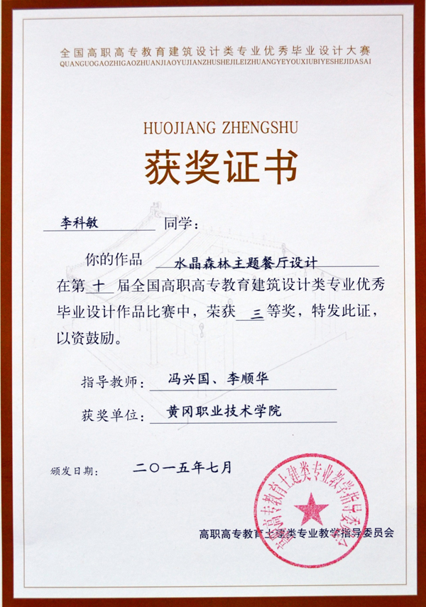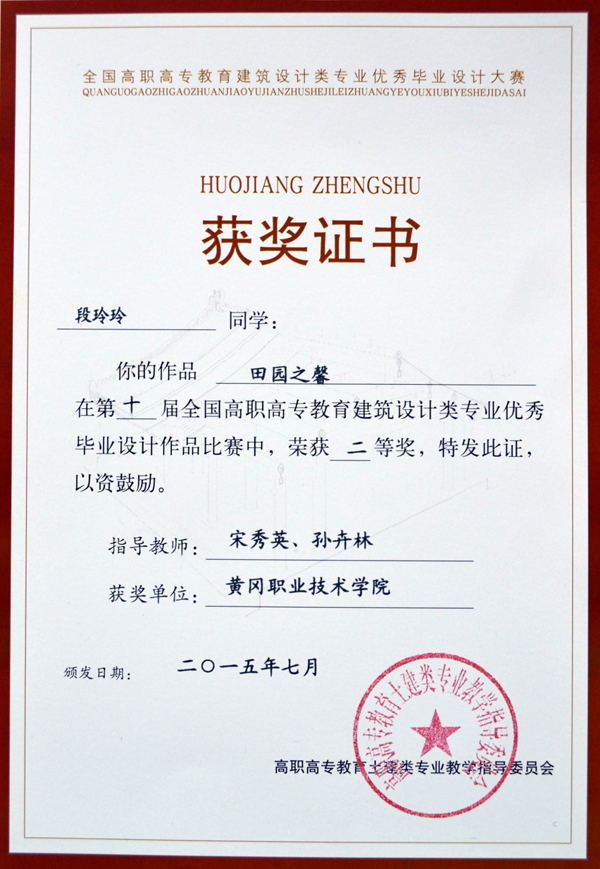 2015年7月24-26日,第十届全国高职高专教育建筑设计类毕业设计作品大赛在西宁(国家级)经济技术开发区隆重举行。taptap点点建筑学院选送的优秀毕业设计作品获二等奖1项、三等奖2项。其中,建筑装饰工程技术专业201201班段玲玲同学的作品《田园之馨》荣获二等奖;装饰201101班李科敏同学的作品《水晶森林主题餐厅设计》荣获三等奖;装饰201101班高瑶同学的作品《别墅庭院设计》荣获三等奖。本次竞赛共有来自全国各高职院校230余份优秀毕业设计作品参加评选,taptap点点在该项赛事中名列前茅。
