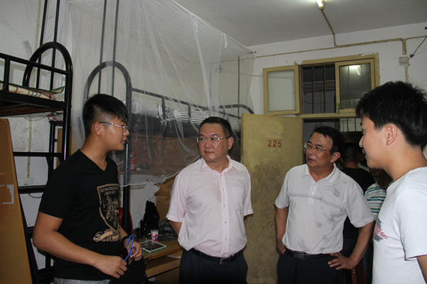 2015年9月6日晚,学校校长姜安心,副书记王维华,副校长段院生、熊发涯、万俊华,工会主席郑柏松,副校长刘东山,党委委员胡燕深入宿舍看望2015级新生和家长。