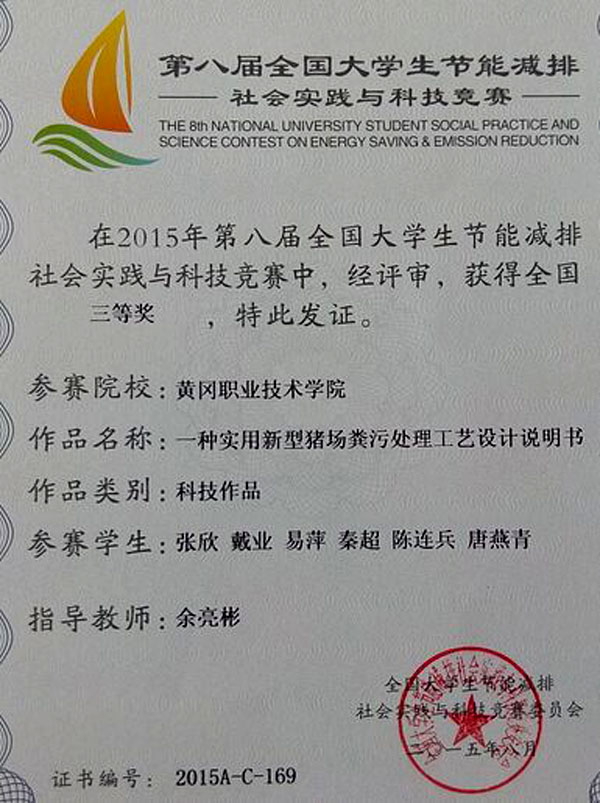 近日,第八届全国大学生节能减排社会实践与科技竞赛落下帷幕,taptap点点生物与制药工程学院畜牧兽医专业余亮彬副教授指导的,2013级学生张欣、戴业、易萍等6人组成的参赛团队,与知名高校硕士生、本科生同场竞技,所申报的参赛作品《一种实用新型猪场粪污处理工艺设计》获得科技类三等奖。