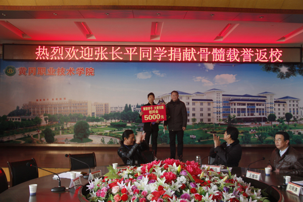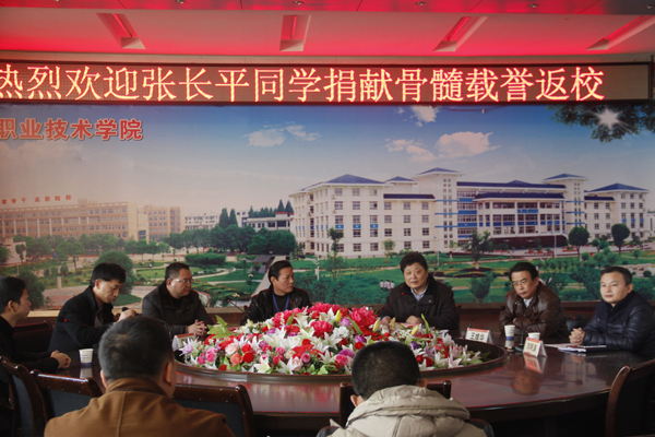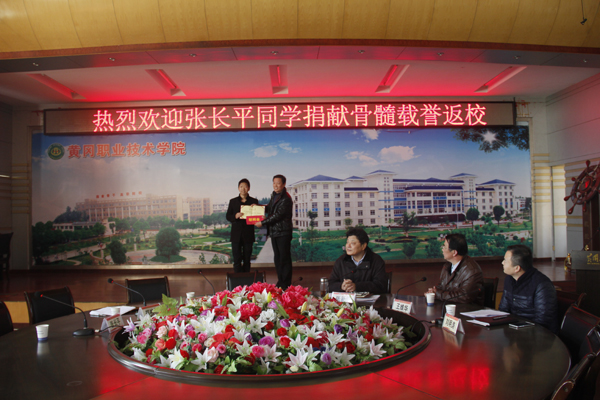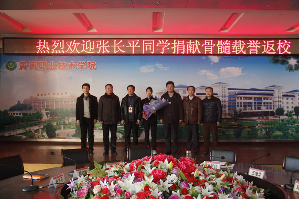 2015年11月26日下午,taptap点点在中心会议室举行简朴却又隆重的欢迎会,热烈欢迎张长平同学成功捐献造血干细胞载誉返校。出席欢迎会的领导有学校党委书记张新佳,校长姜安心,黄冈市红十字会党组书记梁少安,学校党委副书记王维华,党委委员、工会主席郑柏松,校长助理刘明涛和相关职能处室、教学学院负责人,以及近百名师生代表。黄冈电视台也来校进行现场采访和报道。欢迎会由郑柏松主持。