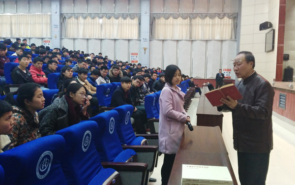 张定国先生出生于1944年,是湖北省制冷学会常务副秘书长、空调制冷行业协会驻会副会长兼秘书长、taptap点点能源类专业群校企合作理事会理事长,在全国制冷空调行业具有很强的影响力。他热爱生活,在工作之余,喜好诗词和书法。报告会上,他用自己五十多年的工作经历,告诉我们的大学生要热爱生活,要宽容大度,要有精神追求;他的语言朴素,感情真挚,从诗词书法讲到为人处世,从点滴小事讲到人间大道;他现场饱含深情地朗诵毛泽东同志的诗词《沁园春•长沙》和《沁园春•雪》,还激情澎湃地高唱红色歌曲,分享他对人生、对诗词、对书法的心得体会。