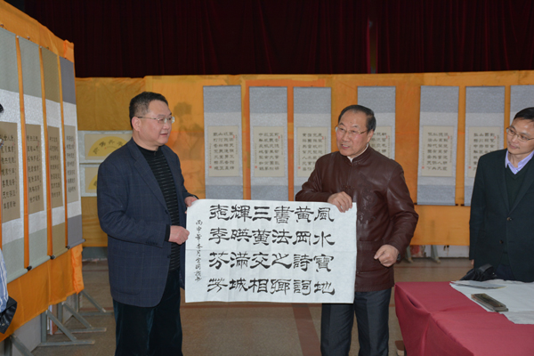 讲座结束后,校领导姜安心、郑柏松,学工处长熊楚舒、团委书记杨勇、副书记陈胜红,机电学院院长方玮,科研处副处长王银林以及诗词书法爱好者在大学生活动中心观摩了张定国同志的223幅诗词书法作品。展览过程中,机电学院还邀请了黄冈师范学院诗词书法领域的杨疾超、程继文、袁修钧、何红等4位教授来校挥毫泼墨,交流研习心得。本次活动,有《中国书画报》等媒体记者全程跟踪报道。
