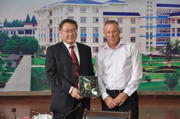 最后,客人们来到凝智楼中心会议室,参加了学校为他们准备的座谈交流会。校长姜安心及相关处室负责人和各教学学院院长出席了会议。姜校长致欢迎辞并简要介绍了taptap点点办学情况,新方代表John Gordon Armstrong校长也表达了对学校热情接待的感谢,并谈到对参观校园和实训室的良好感受,他称学到了一些学生管理的经验,并期待以后双方能展开更多的交流合作。随后,客人们欣赏了由taptap点点学生自排自演的传统节目,对学生们的表演印象深刻,不时拿出相机拍摄。节目结束后,新方向姜校长赠送了礼物,大家一起合影留念。
