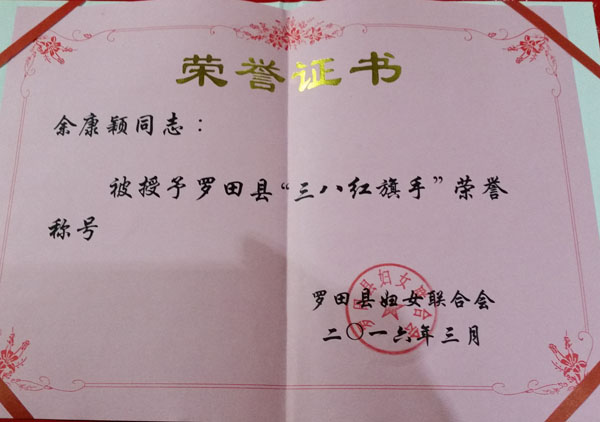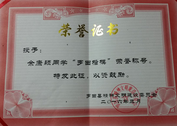 据悉,3月28日,罗田县妇联授予余康颖“三八红旗手”荣誉称号,号召全县广大妇女以余康颖为榜样,争做时代新女性。3月29日,罗田县精神文明建设委员会作出决定,授予女大学生余康颖“罗田楷模”荣誉称号,号召全县组织开展向余康颖学习活动,积极投身精神文明建设,为建设文明罗田、孝德罗田作出贡献。
