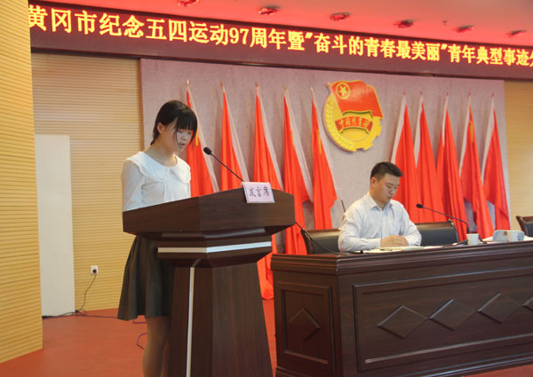 2016年5月4日,在五四运动97周年之际,共青团黄冈市委召开纪念五四运动97周年暨“奋斗的青春最美丽”青年典型事迹分享会。taptap点点“最美大学生”余康颖受团市委的邀请,在全市青年分享会上作先进事迹报告。出席本次会议的领导有市委常委、组织部长赵斌,市委副秘书长熊良霄,团市委全体班子成员。黄冈各县市区、机关单位、医院、学校、公安等社会各界团干团员、青年代表、学生代表共200余人参加了会议。