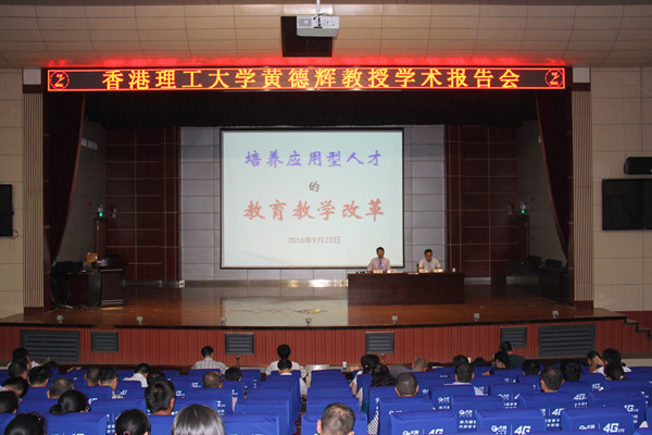 下午2点,黄德辉教授“培训应用型人才的教育教学改革”报告会在学术交流中心举行。校长姜安心、工会主席郑柏松、党委委员胡燕、校长助理刘明涛出席大会,副校长刘东山主持了大会。全体例会人员、无课的专兼职教师参加了大会。黄教授从洗脑袋、学方法、建制度3个方面进行了深入讲解,精彩的报告赢得了与会者多次热烈的掌声。报告会后,刘东山代表学校对黄教授表示衷心感谢,并要求大家要学以致用,不断更新教育教学理念和工作理念,切实推进学校教育教学改革;要系统设计学校管理制度,并狠抓落实,不断提高学校的管理水平。