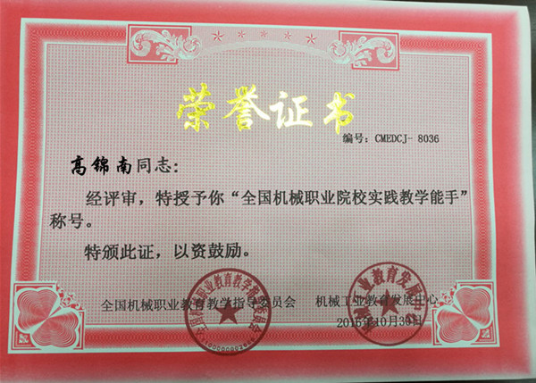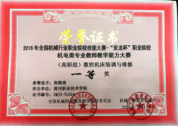2016年10月28日—30日,2016年全国机械行业职业院校技能大赛——“亚龙杯”职业院校机电类专业教师教学能力大赛在江苏省常州市常州机电职业技术学院举行。此次大赛由全国机械职业教育教学指导委员会、机械工业教育发展中心主办,常州机电职业技术学院承办。taptap点点选派机电学院高锦南、潘纹两名老师参加了本次大赛的数控机床装调与维修(个人赛)和工业机器人焊接应用技术(个人赛)两个比赛项目。经过两天的比赛,taptap点点高锦南老师喜获数控机床装调与维修(个人赛)一等奖,潘纹老师喜获工业机器人焊接应用技术(个人赛)三等奖。高锦南老师经全国机械职业教育教学指导委员会和机械工业教育发展中心评审,授予“全国机械职业院校实践教学能手”称号。
