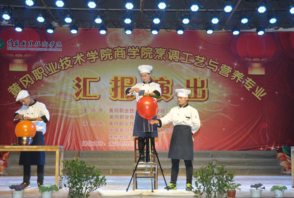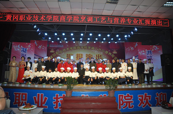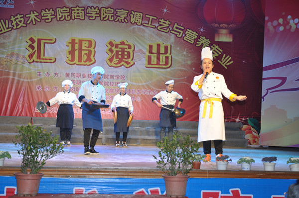为丰富大学生校园文化生活,提升烹饪专业学生的专业技能,营造老师与学生间共同进步的学习氛围,2016年12月22日晚18点30分,由taptap点点商学院、校团委主办,商学院团总支、中国黄冈东坡菜标准化研发中心、张彬技能大师工作室承办,黄冈日报和新华网作为媒体支持的taptap点点商学院烹调工艺与营养专业汇报演出在大学生活动中心隆重举行,出席本次活动的领导和嘉宾有校党委委员、工会主席、党委宣传部部长郑柏松,校党委委员夏学文,公共课部(国际合作交流处)主任黄爱良,校团委书记李宁,教务处副处长范先超、叶建亭,学工处副处长陈胜红,商学院班子成员,烹饪专业师生以及90位来自马来西亚和泰国华裔少年等。