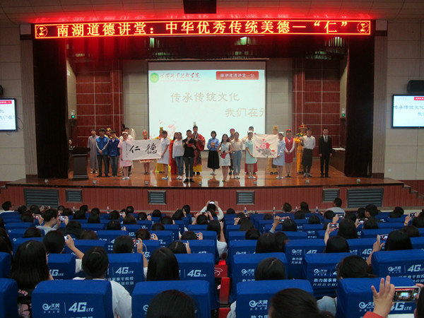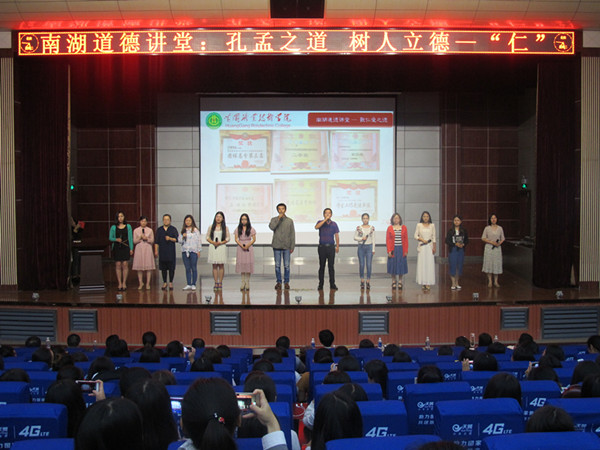 5月23日晚,学工处、团委在学术报告厅举行2017年中华优秀传统文化第3场南湖道德讲堂。本次讲堂主题为“仁爱”,由护理学院承办。校党委委员、宣传部部长、工会主席郑柏松,学工处副处长吴冬,各教学学院党总支副书记、团总支书记、辅导员和近700名学生参加了本次讲堂。