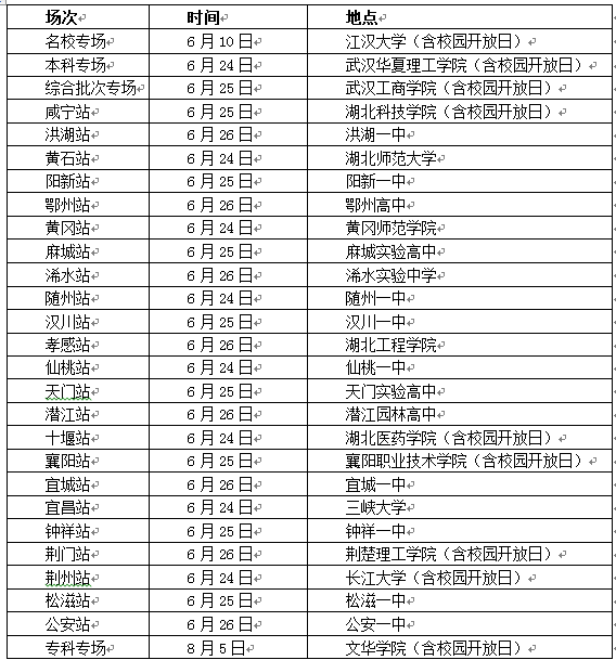 2018年第17届全国高校湖北招生咨询会(以下简称“湖北高招会”)将于6月10日在武汉启动,随后将在湖北省15个地市、9个区县巡回进行,共计27场次(如下图)。